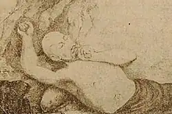 In the week following the battle, the Russian artillery officer Pavel Bestuzhev-Ryumin made a drawing of a half-naked corpse thought to be that of Ghazi Muhammad. This drawing was later lithographed in Tiflis.[42][c] K. Prushanovsky, a Russian officer in Dagestan writing in 1841, writes that "the dead body of Kazi-Mulla [Ghazi Muhammad] was found in such a position that he held his beard with one hand and pointed to the sky with the other." Prushanovsky further suggests that this left a great impression on the people, since it appeared as though Ghazi Muhammad was praying even in death; they began to repent for abandoning Ghazi Muhammad. The modern scholar Patimat Takhnaeva considers Prushanovsky's explanation "absurd".[43][d] The Russians took the imam's body to Tarku, the capital of the Kumyk shamkhal.[41] The body was publicly displayed for a few days, then buried in the hills near the fortress of Burnaya.[45] Later, during Shamil's rule, 200 horsemen were sent at night to exhume Ghazi Muhammad's remains and take them to Gimry.[45] A shrine was built over his grave in Gimry, which has since become a pilgrimage site.[46] Within a few days of his death, Ghazi Muhammad was succeeded as imam by his deputy Hamzat Bek.[47]