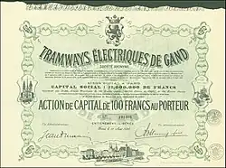 On August 13 of 1897 operating concessions were issued to the Société Anonyme des Railways Économiques de Liège-Seraing et Extensions (RELSE) and the Compagnie Générale des Railways à voie étroite (CGR). These companies merged on January 4, 1898 to form the SA des Tramways Electriques de Gand. The aim of this move was to replace horses by electric traction, as well as the further usage of the tram network. It was also decided to use battery-powered trams, since they did not require unsightly overhead lines.
