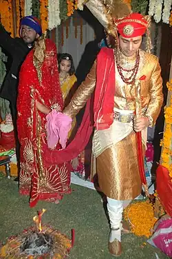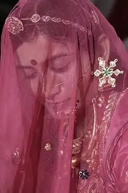 During a marriage ceremony, the bride wears a veil given by her parents. Later, during the ceremony the bride's mother-in-law covers her face with ghoonghat. The bride therefore simultaneously wears the veil given by her parents and that from her in-laws, symbolizing her passing from the protection of one household to another.[28]