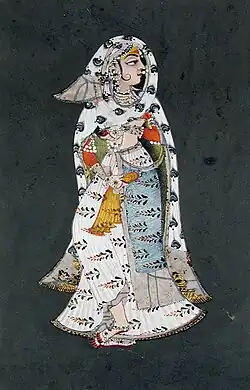 In the Sanskrit play Mṛcchakatika, courtesan Vasantasena's mother sends Vasantasena with her maid and asks her to go in the carriage bedecked with ornaments and an avagunthana veil after receiving ornaments for her daughter from a wealthy suitor to keep her as his mistress. This instruction is taken to signify that a courtesan who has accepted a suitor, had to use a veil in public similar to married women.[13] At the end of the play when Vasanthasena is legally wedded, she receives the title "Vadhūśabda" meaning "title of a bride" simultaneously with the veil "vasantasenām avagunthya" meaning "a token of honorable marriage".[17] In the same literature, the courtesans' maid servant Madanika marries her lover Sarvilaka, a thief who changes his ways. Her new husband told her that she has achieved what is difficult to acquire: "Vadhūśabda avagunthanam" meaning "the title and veil of a bride".[17]