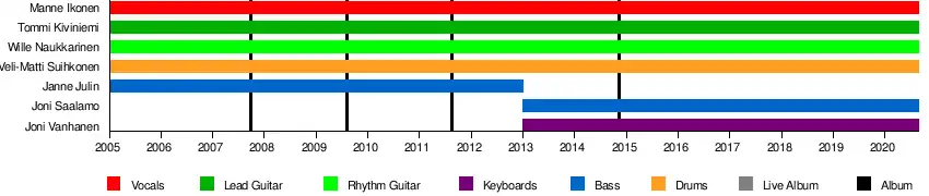 In 2013, long-time bassist Janne Julin left the band and was replaced Joni Saalamo. The band also acquired a new keyboardist in Joni Vanhanen. With this new lineup, the band recorded their fourth studio album, titled IV: One with the Storm. It was released on 7 November 2014, again via Season of Mist. The album was produced by the band and Tuomas Kokko.[3] In December of the following year, the band announced an indefinite hiatus in a Facebook post.[4]