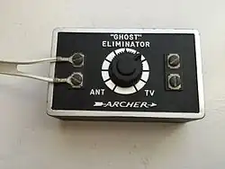 In television, a ghost is a replica of the transmitted image, offset in position, that is superimposed on top of the main image. It is often caused when a TV signal travels by two different paths to a receiving antenna, with a slight difference in timing.[1]