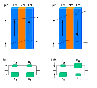 The effect is observed as a significant change in the electrical resistance depending on whether the magnetization of adjacent ferromagnetic layers are in a parallel or an antiparallel alignment. The overall resistance is relatively low for parallel alignment and relatively high for antiparallel alignment. The magnetization direction can be controlled, for example, by applying an external magnetic field. The effect is based on the dependence of electron scattering on spin orientation.