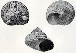 | Three views of a shell of Gibbula loculosa | |