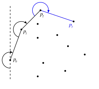 The gift wrapping algorithm begins with i=0 and a point p0 known to be on the convex hull, e.g., the leftmost point, and selects the point pi+1 such that all points are to the right of the line pi pi+1. This point may be found in O(n) time by comparing polar angles of all points with respect to point pi taken for the center of polar coordinates. Letting i=i+1, and repeating with until one reaches ph=p0 again yields the convex hull in h steps. In two dimensions, the gift wrapping algorithm is similar to the process of winding a string (or wrapping paper) around the set of points.