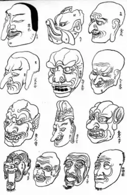 - ^ a b c d e f g Shinchosha 1985, p.357-8, on gigaku men (mask)