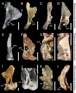 The ilium of the pelvis had a convex upper border, a low postacetabular blade (behind the acetabulum), and a narrow brevis-shelf (a projection where tail muscles attached). The pubic foot was pronounced and shorter at the front than behind. The ischium was straight and expanded hindwards, ending in a lobe-shape. The femur was sigmoid-shaped, and had a very robust, upwards pointing head, with a deep sulcus (groove). The lesser trochanter of the femoral head was wing-like, and placed below the greater trochanter, which was short. The fourth trochanter was large and projected backwards. The tibia of the lower leg was expanded at the upper end, its articular facet (where it articulated with the femur) was wide, and its shaft was compressed from front to back.[1]
