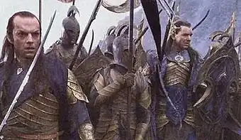 He became the High King of the Noldor-in-Exile in Beleriand after the fall of Gondolin and the death of the previous High King, Turgon.[T 3] After the War of Wrath and the end of the First Age, Gil-galad founded a realm in the coastal region of Lindon along the shores of Belegaer, the Great Sea. At its height, his realm extended eastward as far as the Misty Mountains.[T 4] King Tar-Aldarion of Númenor presented Gil-galad with the gift of some seeds of the Mallorn tree; he in turn gave some to Galadriel, who grew them in the guarded land of Lothlórien.[T 5] Gil-galad did not take a wife and had no children. He was the first of the Eldar to mistrust a stranger who called himself Annatar, and forbade him from entering Lindon. His mistrust was well founded, for Annatar was in fact Sauron.[T 4] About the year 1600 of the Second Age, Sauron secretly forged the One Ring. Celebrimbor, the creator of the Three Rings, gave two of them, Narya and Vilya, to Gil-galad for safe-keeping once he knew Sauron's intention to take them. Gil-galad passed Narya to Cirdan the shipwright, who stated that this was only to keep it secret; Cirdan never used it. Gil-galad chose to give Vilya, and control of Eriador, to Elrond.[1][T 6] War broke out between the Elves and Sauron; Gil-galad asked the Númenóreans for help, and their king Tar-Minastir brought a great force, enabling Gil-galad to defeat Sauron's army.[T 6]