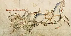 Earl Gilbert's tenure of the earldom is notable for the consequences of the violent death of his elder brother at Kildare. Gilbert was bound in honour to punish those responsible, especially as he had to establish his credentials as a knight and the head of the powerful Marshal affinity in England, Wales and Ireland. Rather than single out Walter de Lacy and Richard de Burgh who were principally responsible for the death, he fixed on Maurice Fitz Gerald lord of Offaly and the king's justiciar, and solemnly swore mortal enmity against him. This brought the full weight of the whole Marshal clan and their powerful relatives and vassals against Fitz Gerald until he undertook to make restitution for Earl Richard's death. King Henry III was willing to act as an intermediary and in August 1234 Fitz Gerald made a formal admission of responsibility to the earl. This did not by any means end the antagonism between Gilbert and Fitz Gerald, and the murder at Westminster of Henry Clement, Fitz Gerald's agent, in 1235 was believed to have been procured by the earl. The feud was not settled until in 1240 the earl pardoned Fitz Gerald his mortal enmity on his promising to found an abbey for the sake of the soul of the late Earl Richard. Even so, the notorious antagonism between the aristocratic groups had so disturbed the political community and court that when Earl Gilbert died violently on the tournament field of Ware on 27 June 1241 it was commonly believed that agents of the Fitz Geralds had a hand in the affair. Gilbert's death was more likely the consequence of a need to justify the Marshal name and live up to his father's and brothers' reputations, for the St Albans chronicler Matthew Paris reported gossip that Gilbert was 'inexperienced and useless as a knight'. There was some truth in it, as his inability to manage the magnificent but wild Spanish stallion he had selected for the day's sport led to his being thrown from his horse and dragged for some distance on the ground. He died later that evening from the injuries received. He was buried at Temple Church next to his father. His title was passed to his younger brother Walter a year after his death. Walter was not immediately confirmed as Earl of Pembroke and Lord Marshal due to the King's anger at Walter's disobedience of royal orders, as he had also attended the tournament.[7]