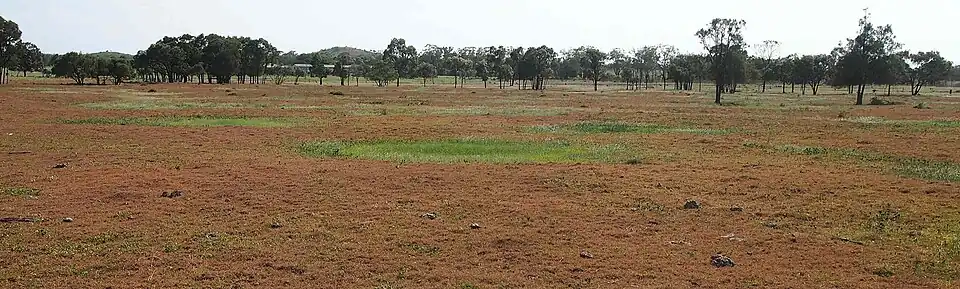 A gilgai is a small, ephemeral lake formed from a surface depression in expanding clay soils. Gilgai is also used to refer to the overall micro-relief in such areas, consisting of mounds and depressions. The name comes from an Australian Aboriginal word meaning small water hole.[1] The pools are commonly a few metres across and less than 30 cm (12 in) deep but, in some instances, they may be several metres deep and up to 100 m (330 ft) across. Gilgais are found worldwide wherever there are cracking clay soils and marked wet and dry seasons.[1] Gilgais are also called melonholes, crabholes, hogwallows, or puff and shelf formations.[2]