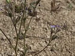 The plant produces spindly, spreading stems which sometimes have clinging, cobweb-like fibers. Leaves appear in a basal rosette and also sparsely along the stems. They are each divided into toothed leaflets. Atop the stem branches are inflorescences of small flowers each up to a centimeter across. The pedicels bearing the flowers are abundantly coated in stalklike glandular hairs. Each small flower is lavender with a white or yellowish throat and tiny protruding stamens.
