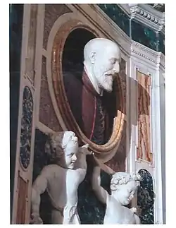 He also made works in other Roman churches such as the Santa Maria Maggiore and the Santa Maria in Vallicella.[17] In the past two bas-reliefs on the funeral monument of Pope Pius V in the Santa Maria Maggiore were attributed to van den Vliete. although some art historians have attributed these to Mostaert: one representing the pontiff giving a standard to Admiral Marcantonio Colonna, at the time of his departure for the battle of Lepanto (1571) where he commanded twelve galleys and the other showing the same pontiff handing the baton of command to the Count of Santa Fiore before his departure for France at the head of an army of the Holy See. In the same church, he has been traditionally credited with creating for the funeral monument of Pope Sixtus V, two bas-reliefs, one having as its subject the canonisation of Saint Didacus of Alcalá and the other, the pontiff's deputy sending Cardinal Cinzio Aldobrandini to Germany as a legate.[12] The Coronation of Pius V in this monument is also attributed to van den Vliete.[14] A further tomb monument in the same church has been attributed to van den Vliete. It is the tomb monument for Cardinal Francisco de Toledo, which he created in 1598 after a design by Giacomo della Porta. The monument is similar to other designs by della Porta in the church. The portrait of Toledo is similar to that of Sixtus V in the same church.[14]