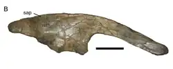 A complete skull articulated is not known from the multiple specimens, however, numerous elements are known such as the right maxilla, dentary, jugal, squamosal and two lacrimals, quadrate and a complete predentary. In a lateral view, the right maxilla of specimen AMNH FARB 30653 is triangular in shape with various foramina on the surface. On the inner side 26 alveolar foramen are preserved and 22 alveoli are filled with teeth but the total count may be unknown due to incompleteness, the surface of this side is rather flat. The teeth are oval-shaped with a moderately pinched upper end and have coarse denticles, these denticles have three diminutive pointed structures. It appears to be that the dentary teeth were more flattened with a pinched lower end as indicated by nine isolated teeth. In all teeth, a ridge-like structure is located at the center. An isolated and partial right jugal is represented by AMNH FARB 30657, which has lost most of the anterior area in the rostral joint. It has a triangular-shaped form in a lateral view and flattened to the inner sides. The partial rostral joint is square and the lateral surface is somewhat concave but in the medial surface the articulation for the maxilla can be identified. The upper surface of the rostral joint forms a flattened socket-like structure that continues towards the rear with the base of the postorbital ramus. This ramus is projected to the top and slightly tilted towards the rear. The upper portion of the postorbital ramus is triangular when seen from the cross-section. Towards the lower end, the anterior surface of the ramus is clipped with a triangle-like pit that wedges towards the bottom to configurate the lower end of the jugal ramus of the postorbital.[4]