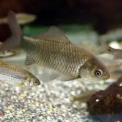 - ^ a b Rylková, Kateřina; Kalous, Lukáš; Bohlen, Jörg; Lamatsch, Dunja K.; Petrtýl, Miloslav (2013). "Phylogeny and biogeographic history of the cyprinid fish genus Carassius (Teleostei: Cyprinidae) with focus on natural and anthropogenic arrivals in Europe". Aquaculture. 380–383: 13–20. Bibcode:2013Aquac.380...13R. doi:10.1016/j.aquaculture.2012.11.027.