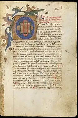 Ruffo's single book was written in Latin and is considered as one of the earliest works on veterinary medicine. The book had six parts covering reproduction; training of foals; maintenance; qualities and defects; diseases; and treatments. There are about 173 manuscript copies known of the work and about 16 print versions translated into Italian, Latin, French, German,[2] Catalan, Galician, Occitan and Hebrew. The best known edition is Jordani Ruffi Calabriensis Hippiatria (Padua, 1818). Several later derivatives editions exist including Mulomedicina (or Medela equorum ) by Teodorico Borgognoni (late 13th century); Marescalcia by Dino Dini, Traité d'hippiatrie by Guillaume de Villiers (15th century); and Manuschansia by Agostino Colombre (1490).[3][4][5]
