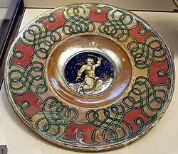 In 1498, he became a citizen of Gubbio and in 1518 invented his remarkable lustre, the chief characteristics of which are its beautiful gold and carmine colors. Good examples of his majolica may be found in the local museums of Gubbio, Urbino, Arezzo, and elsewhere in Italy, and also in the principal museums of decorative art in Europe, such as Berlin, Vienna, Paris, and South Kensington.[1]