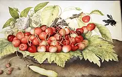 Giovanna Garzoni (1600 – February 1670) was an Italian Baroque painter. She began her career painting religious, mythological, and allegorical subjects but gained fame for her still life botanical subjects painted in tempera and watercolour.[2][3] Her works were praised for their precision and balance and for the exactitude of the objects depicted.[4] More recently, her paintings have been seen to have female bodily associations and proto-feminist sentiments.[5][6] She combined objects very inventively, including Asian porcelain, exotic seashells, and botanical specimens.[7] She was often called the Chaste Giovanna due to her vow to remain a virgin.[8] Scholars have speculated Garzoni may have been influenced by fellow botanical painter Jacopo Ligozzi[9] although details about Garzoni's training are unknown.