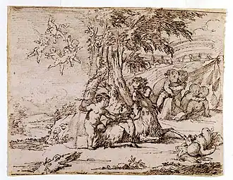 Giovanni Andrea Podestà or Giovanni Andrea Podesta (1608 - c. 1674) was an Italian painter and engraver who was principally active in Rome. His principal subject matter is children playing in landscapes with classical objects. His works show the influence of Poussin's Arcadian landscapes and bacchanals, which were ultimately derived from Titian's bacchanals.[1]