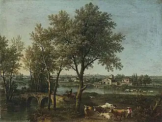 He was born in Salò on Lake Garda, not far from Brescia. He studied under Antonio Aureggio and later in Bologna with the landscape painter Antonio Calza,[2] before moving to Venice around 1713.[3] Cimaroli's rustic landscapes are reminiscent of the Arcadian scenes of Francesco Zuccarelli,[4] influenced by a tradition of Lombardian realism.[5]