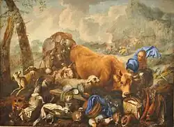 Castiglione was famous for his ability to paint animals, mostly farm animals, and they were often a dominant motif in his paintings. For example, in the painting of Jesus clearing the temple of Moneylenders, the religious event is a minor, background part of the painting, the stampede of animals is far more prominent than the scattering of bankers. Castiglione's attention to detail in the depiction of nature is regarded as proof of the influence of Scorza and the Flemish still life and animal painter Jan Roos who was a long-term resident of Genoa.[7] It has been suggested that it was Jan Roos who convinced Castiglione to enliven his religious and mythological compositions with animal and still-life elements.[8]