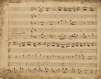 His earliest works for the cello are two Sinfonie included in a manuscript in the abbey of Montecassino.[6] His other works include a number of operas, masses, and a funeral anthem for the Duke of Marlborough. One of his operas, Xerse, parodied material in an earlier setting of that opera by Francesco Cavalli, including the aria "Ombra mai fu". Bononcini's Xerse was in turn adapted by Handel in his Serse with a third (and best known) version of "Ombra mai fu". Bononcini's song "Vado ben spesso cangiando loco" was used by Franz Liszt in his suite for piano Années de pèlerinage: Deuxième année: Italie under the erroneous title "Canzonetta del Salvator Rosa".