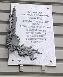 In this house died, poor and uncontaminated Giovanni Bovio, who by meditating with free spirit the infinite and consecrating the reasons of the peoples in adamantine pages, revived with great splendor Italian thought and was a prescient seer of the new age. U Buccini 1905