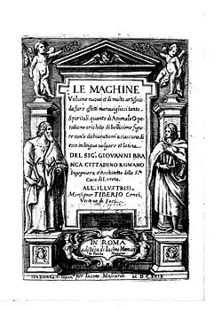 Branca designed many different mechanical inventions, a collection of which he dedicated to Cenci, the governor of Loreto, Ancona. These were later published in book form at Rome in 1629, under the title Le machine.[2] The work contains 63 engravings with descriptions in Italian and Latin and was an example of the Theater of machines genre which had appeared in the 16th century, named after Jacques Besson's Theatrum Instrumentorum of 1571. However, where Besson's book had been beautifully illustrated with engravings, Branca's book was a small octavo volume illustrated with relatively poor quality woodcuts.