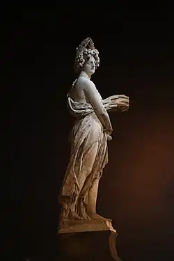 Fragmentary antiquities were not to the sixteenth-century collectors' taste. Caccini produced a head for an antique torso, and a further, crouching figure to produce the Bacchus and Ampelos in the Uffizi, which was once attributed to Michelangelo.[2] He restored a fragmentary Apollo Sauroctonos as an Apollo with the Lyre (Uffizi). He could also improvise on antique themes: the biographer of artists Rafaello Borghini reported in 1730 that "In truth he was highly skilled in diligently putting together pieces, and counterfeiting, the Antique."[3]