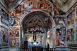 Canavesio started his work in the Chapel of Notre-Dame des Fontaines, near La Brigue, with eleven displays of Virgin's life and Christ's childhood: the Nativity of the Virgin, her Presentation in the Temple, her Marriage, the Annunciation, the Visitation, the Nativity of Christ, his Circumcision, the Adoration of the Magi, the Massacre of the Innocents, the Flight into Egypt, and the Presentation in the Temple. For some paintings, he collaborated with Jean Baleison, for example in the ones of the choir that were discovered under a layer of whitewash in the 1950s.[17] The inscription of the paintings on the north wall documented Canavesio's craft and completion in October 1492 but was fallen and covered by a new one that indicated Canavesio's involvement. However, it did not articulate that all the paintings were done by Canavesio, not mentioning workshops or collaborations but the general conception of the Passion Cycle would be done by Canavesio himself.[4] The scene depicting the Virgin in the paintings of the triumphal arch would also be his collaboration with another artist.[1] Canavesio executed the nave paintings following the tradition of Italian Renaissance practices.[18] The gold and tinfoil he used now turned black due to oxidation but was restored around 1849.[4]