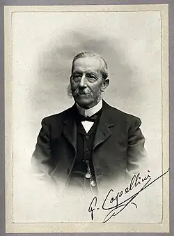 Starting with the 2nd Congress of Naturalists, held in La Spezia in 1865, Capellini led a series of international scientific congresses.[3] In 1876 he was a member of the founding committee of the International Geological Congress.[6] In 1873, he was elected as a member to the American Philosophical Society.[7] Capellini was several times rector of the University of Bologna, and initiated the Geological Map of Italy project. From 1883 he was often President of the Italian Geological Society. He was also a member of the Accademia dei Lincei and many other societies. He died on 28 May 1922 in Bologna.[1]