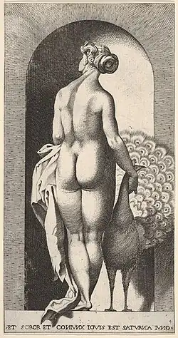 Juno with her peacock, from the "Gods in Niches" series, to drawings by Rosso Fiorentino, c. 1526