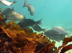 Parore are found in shallow coastal and estuarine waters where the frequently congregate in large schools in the vicinity of rocky outcrops and jetties. The small juveniles use seagrass beds to hide from predators.[4] The species use their small sharp, incisor-like teeth for grazing on seaweed and algae such as Enteromorpha intestinalis, Ulva lactuca, Ulva intestinalis and sea cabbage, and use a band of crushing teeth which are used to grind algae. While primarily consuming algae, the species is an opportunistic omnivore, feeding on other food items like small crustaceans, pipi, mussels and worms.[5][7] As parore mature, they congregate in large shoals and the adults form 'runs' from estuarine waters and coastal lakes into the sea. The fish spawn in the surf zone and mouths of estuaries,[1] spawning takes place in the winter.[8]