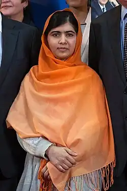 Malala Yousafzai, a Pakistani girl who was shot in the head and neck by Taliban gunmen for going to school[52]