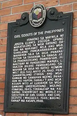 The Girl Scouts of the Philippines (GSP) is the national Girl Scouting association for girls and young women in the Philippines. Its mission is "to help girls and young women realize the ideals of womanhood and prepare themselves for their responsibilities in the home, to the nation, and to the world community".[1] The girls-only association serves 800,000 members, as of 2017.[2]