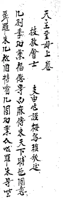 All but one of the extant, 17th-century Christian works written in chữ Nôm can be positively attributed to Maiorica.[10] These works are seen as a vital resource for research into chữ Nôm, as well as historical dialects, vocabulary, and phonology of Vietnamese.[11] To translate Catholic theological concepts, Maiorica favored plain, commonly understood vocabulary over Sino-Vietnamese vocabulary, even in cases where the latter would have been consistent with the terms used by his Jesuit colleagues in China. For example, he referred to God as Đức Chúa Trời Đất (literally, "Virtuous Lord of Heaven and Earth"; 德主𡗶坦) instead of Thiên Địa Chân Chúa 天地眞主 and to the Eucharist as Mình Thánh ("Holy Body"; 命聖) instead of Thánh Thể 聖體.[12] Today, Thiên Chúa 天主 and Thánh Thể 聖體 are the preferred terms, respectively. Many of the terms he coined would later become popular, such as sự thương khó 事傷𧁷 (passion), rỗi linh hồn 磊靈魂 (salvation of souls), tin kính 信敬 (to believe, appearing in the creeds), khiêm nhường chịu lụy 謙讓召累 (humility and submission), hằng sống 恒𤯩 (eternal life), cả sáng 奇創 (hallowed, appearing in the Lord's Prayer), etc.[5]