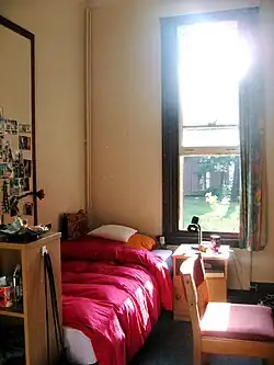It is customary for Cambridge colleges to provide accommodation for the first three-year undergraduate students. Rooms in the main site are arranged along corridors, which makes it possible to walk from one location in the building to another without going outside.[40] Some of the rooms were originally designed as sets by Alfred Waterhouse.[41] The rooms range in several quality grades but are all charged at the same weekly rate.[42] Girton, along with Newnham College, are the only colleges to charge the same fee for all undergraduate accommodation on their premises.[43] The main site offers 348 rooms,[44] rented for the entire year (38 or 39 weeks, depending on the term dates).