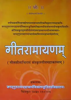 Gītarāmāyaṇam (Sanskrit: गीतरामायणम्) (2011), literally The Rāmāyaṇa in songs, is a Sanskrit epic poem (Mahākāvya) of the Gītakāvya (lyrical poetry) genre, composed by Jagadguru Rambhadracharya (1950–) in the years 2009 and 2010. It consists of 1008 songs in Sanskrit which are divided into seven Kāṇḍas (books), every Kāṇḍa being sub-divided into one or more Sargas (cantos). There are 28 cantos in all, and each canto consists of 36 songs. The songs of the epic are based on rhythms and tunes or Rāgas found in the folk music and classical music of India. In the epic, each song in sung by one or more characters of the Rāmāyaṇa or by the poet. The songs progressively narrate the Rāmāyaṇa via monologues, dialogues and multilogues. There are occasional Sanskrit verses between the songs, which take the narrative forward.