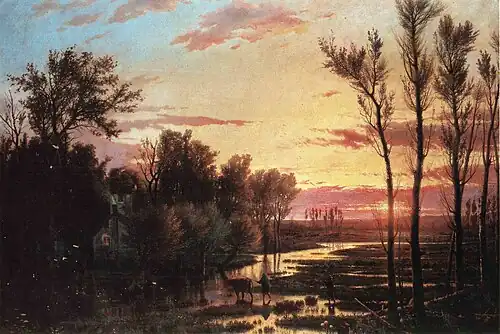 A major influence on his style came from his son Guido Carmignani, who would also become a notable painter. Guido had made a trip to Paris to research the latest trends in art and shared his enthusiasm for them, especially the Barbizon school.[1] Inspired by this, Giulio created what are considered to be his masterpieces: "Un tramonto dopo la pioggia" (Sunset After the Rain, 1864) and "Colpo di Vento" (Gust of Wind, 1870), both of which are now in the Galleria nazionale di Parma.