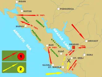 In the period 1419–1426, Gjon was an ally of Serbian Despot Stefan Lazarević, who was also an Ottoman vassal. Lazarević had taken Zeta from Balša III in 1421, but the Venetians did not recognize him, holding on to the occupied Zetan coast and Buna, including Drivast.[15] In August 1421, Lazarević led armies into Zeta and took Sveti Srdj, Drisht, and Bar; the Venetians concluded a truce and now held only the towns of Shkodër, Ulcinj, and Budva. When Lazarević demanded the surrender of these towns, Venice refused, and the war resumed.[15] A number of Gjon Kastrioti's Albanians, led by one of his sons, joined Lazarević immediately upon the latter's arrival in Zeta.[16][17] According to Fan Noli, it was Stanisha who was sent by his father, together with auxiliary forces, to help the Serbian despot capture Shkodër from Venetians.[18] Lazarević besieged Shkodër, probably in June 1422, and for a year, it seemed that Venice would have lost their possessions; however, supported by some local Albanians, Venice managed to break the siege in December 1422.[19] In January 1423, Venice bribed and won over the Pamaliots on Bojana and then bought over several tribal leaders in or near Zeta: the Paštrovići, Gjon Kastrioti (who had extended to the outskirts of Lezhë), the Dukagjins, and Koja Zaharia.[19] Though none of these were mobilized militarily by Venice, they left the ranks of Lazarević's army and thus became a potential danger to Lazarević.[19] Although Venetian admiral Francesco Bembo offered money to Kastrioti, Dukagjins, and Koia Zaharia in April 1423 to join the Venetian forces against the Serbian Despotate (offering 300 ducats to Gjon Kastrioti), they refused.[20]