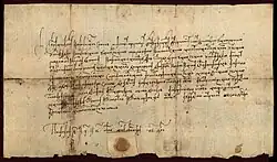 In the Slavic archival sources of the time, Scanderbeg's father is variously called Ivan Castriothi,[46] Ivanus Castrioti,[47] Juano/Juanum Castrioti,[48] Juannus Castrioti,[49] Juanum, Johanni, Ivanus, Ivani,[50] Iohannes, Janus, Iouan, Ioannis, Yuan, Ivan, Yuvan, etc.[51] In the few acts of his own chancellery, his name results Ivan or Ivanъ; his Slavonic acts were probably written by Ninac Vukosalić.[52][53] Besides the acts in Slavonic, Ivan is used by some Byzantine chroniclers, like Laonicus Chalcocondyles (Ὶβάνης)[54] and many works written by the contemporary scholars. Contemporary Ottoman documents refer to him as Yuvan, to his lands as Yuvan-ili while his son George was referred to as Iskender Bey Yuvan Oglu. Giovanni Musachi (fl. 1510) in his work written in Italian, calls him Giovanni, which is also used by Demetrio Franco (1443–1525). Marin Barleti in his 1508–10 Latin work, calls him Iohannes. Frang Bardhi (1606–1643) in his Apology, dwelling on an Albanian named Gjon Kastrati, states that: "Gion, which in Latin is Iohannis".[55]