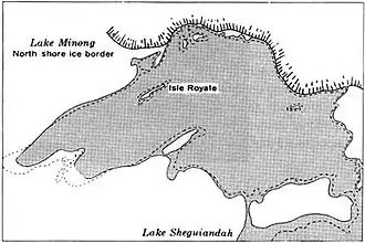 Lake Minong was a proglacial lake that formed in the Lake Superior basin during the Wisconsin glaciation around 10,000 B.P. This was the last glacial advance that entered Michigan and covered only part of the upper peninsula. Lake Minong occurred in the eastern corner of the Lake Superior basin while Lake Duluth was in the western end. The lakes became separated when the glacier reached the upper peninsula. Lake Minong expanded to the north as the ice retreated after 9,800 B.P. When the ice retreated from the Keweenaw Peninsula, Lake Duluth merged into Lake Minong.[1]