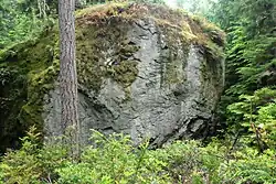 The Pleistocene ice age glaciation of Puget Sound created many of the geographical features of the region, including Puget Sound itself,[1] and the erratics are one of the remnants of that age.[2] According to Nick Zentner of Central Washington University Department of Geological Sciences, "Canadian rocks [are] strewn all over the Puget lowland, stretching from the Olympic Peninsula clear over to the Cascade Range."[3] Erratics can be found at altitudes up to about 1,300–1,600 feet (400–490 m) in the Enumclaw area,[4] along with kames, drumlins,[5] and perhaps also the unique Mima mounds.[6] The soil of Seattle, the state's largest city, is approximately 80% glacial drift, most of which is Vashon glacial deposits (till),[7] and nearly all of the city's major named hills are characterized as drumlins (Beacon Hill, First Hill, Capitol Hill, Queen Anne Hill) or drift uplands (Magnolia, West Seattle).[3][8] Boulders greater than 3 meters in diameter are "rare" in the Vashon till,[2] but can be found, as seen in the table below.