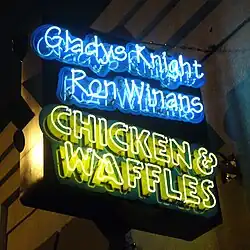 Knight's son Shanga Hankerson owns a chain of chicken and waffles restaurants based in Atlanta, bearing her name.[48] Gladys Knight & Ron Winans' Chicken & Waffles opened three locations in the Atlanta area. One location was featured on the Travel Channel original series Man v. Food.[49] In June 2016, authorities in Georgia raided two of the restaurants and its headquarters.[50]