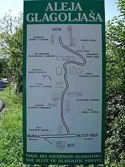 Glagolitic Alley (Croatian: Aleja glagoljaša) is a memorial composed of a string of eleven outdoor monuments dotting the road between the villages Roč and Hum in Croatia.[1] Sculptures were erected between 1977 and 1985 to honor the historical Croatian scribal tradition in Glagolitic script.[2] The road is seven kilometers (4.3 mi) long and located in the region of Istria.