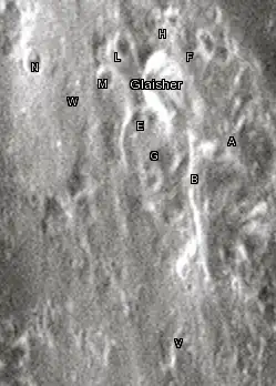 By convention these features are identified on lunar maps by placing the letter on the side of the crater midpoint that is closest to Glaisher.