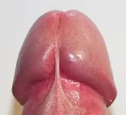 In male human anatomy, the glans penis or penile glans,[1] commonly referred to as the glans, (/ɡlænz/; from Latin glans meaning "acorn")[2] is the bulbous structure at the distal end of the human penis that is the human male's most sensitive erogenous zone and primary anatomical source of sexual pleasure.[3][4] The glans penis is part of the male reproductive organs of humans and most other mammals where it may appear smooth, spiny, elongated or divided.[5] It is externally lined with mucosal tissue, which creates a smooth texture and glossy appearance. In humans, the glans is located over the distal end of the corpora cavernosa and is a continuation of the corpus spongiosum of the penis. At the tip is the urinary meatus and the base forms the corona glandis. An elastic band of tissue, the frenulum, runs across its ventral surface. In men who are not circumcised, it is completely or partially covered by a fold of skin called the foreskin. In adults, the foreskin can generally be retracted over and past the glans manually or sometimes automatically during an erection.[6]