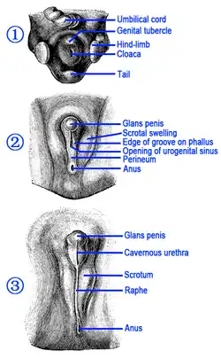 Both the penis and clitoris develop from the same tissues that become the glans and shaft of the penis and this shared embryonic origin makes these two organs homologous (different versions of the same structure).[8][45] In the female fetus the absence of testosterone will stop the growth of the phallus causing the tubercle to shrink and form the clitoris. In the male fetus the presence of a Y chromosome leads to the development of the testes, which secrete a large amount of hormones called androgens. These hormones will cause the masculinization of the phenotypically indifferent organs.[7] When exposed to testosterone, the genital tubercle elongates to form the penis. By fusion of the urogenital folds—elongated spindle-shaped structures that contribute to the formation of the urethral groove on the belly aspect of the genital tubercle—the urogenital sinus closes completely to form the spongy urethra and the labioscrotal swellings unite to form the scrotum.[46][8] The secretion of testosterone during this phase plays a decisive role in the final shaping of the penis. After birth, testosterone levels drop significantly until puberty.