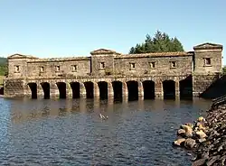 At Milngavie, Mugdock Reservoir was built as a holding reservoir for water arriving from Loch Katrine. A number of buildings with rubble walls and slate roofs dating from this first phase survive.[15] In the 1890s when the pipeline was doubled, Craigmaddie reservoir was built to act as a second holding reservoir. Work started on 1 May 1896 and it was completed on 11 June 1896, but there were problems with leakage, and a deep trench was cut to resolve the issue, so it was not operational until 1 January 1897.[16] A causeway and dam, which is faced with rubble, separates the two reservoirs. Both reservoirs have a draw-off tower and straining well, to remove debris from the water supply. The straining wells were decommissioned in 2007 as part of the construction of a new treatment works.[17][15]