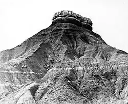 The first American explorers referred to this feature as the "Shining Mountains," when they saw the formation in 1821.[3] The name Glass Mountains has been attributed to an explorer named Thomas James.[5] James visited this area during 1821, while on a trading expedition along the Cimarron River.[6] In 1875, a transcription error by a mapmaker resulted in the name Gloss Mountains which is still a somewhat common name for the mountains.[7]
