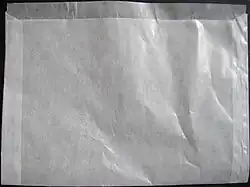 Glassine has been recommended for protecting the surface of stored acrylic paintings.[1] However, glassine will adhere to soft (not completely cured) and medium-rich paint, especially when stored for an extended period of time and it may cause permanent damage to the painted surface. Therefore, art conservators do not recommend that it be used to wrap paintings. Philatelists use glassine envelopes to store stamps, and stamp hinges are made of glassine.[2] Amateur insect collectors use glassine envelopes to store specimens temporarily in the field before they are mounted in a collection. Entomologists collecting for research may likewise use such envelopes to store whole specimens in the field. Glassine envelopes carry pharmacy reformulated drugs and illicit drugs such as cocaine and heroin.[3][4] Photographers used glassine sleeves for many decades to safely store their processed films. Glassine is also used to pack firecrackers, as it is moisture resistant. It is used for its transparent qualities to fold origami tessellations.[5][6] Glassine is an outer covering on paperboard tubes, particularly those used in model rocketry, for water protection.